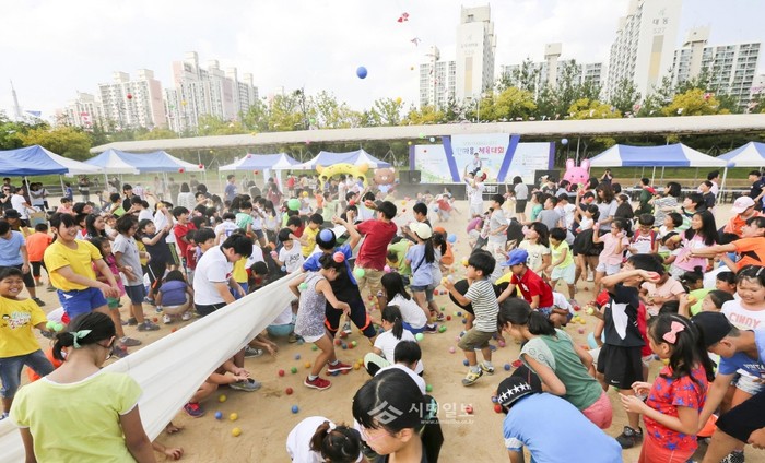 지난 13일 인천시 계양구 서운체육공원 운동장에서 열린 '계양구 지역아동센터연합회 한마음 체육대회'에 참가한 지역아동센터 이용아동 및 학부모, 센터 관계자들이 팀별 대항 공놀이를 하고 있다. (사진제공=계양구청)