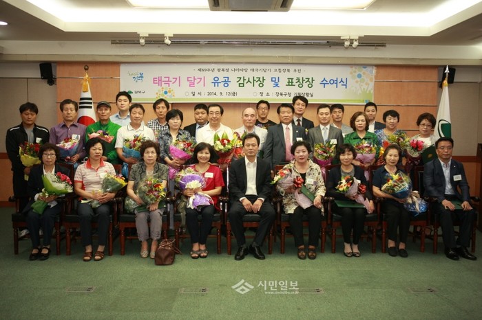 서울 강북구는 지난 12일 구청 기획상황실에서 태극기 달기운동에 적극 참여한 기관, 단체 및 지역주민들에게 감사장 및 표창장을 수여하는 '태극기 달기 유공 감사장 및 표창장 수여식'을 열었다. 사진은 수여식이 끝난 후 수상자들과 박겸수 강북구청장(앞줄 가운데)의 모습. (사진제공=강북구청)