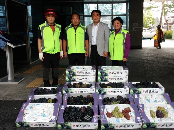 경기 포천시 가산면 주민자치위원회는 최근 가산삼거리부터 고인돌사거리까지 약 1km의 도로부지 법면의 포도나무 가로수길에서 수확한 가산꿀포도 25박스를 희망나눔추진위원회와 지역내 유관기관 및 어려운 이웃에게 전달했다. (사진제공=포천시청)