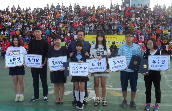 지난 13일 서울 금천구가 '생명사랑 생명존중 Happy Walking 금천 한가족 건강걷기대회'를 열고 '자살예방 및 생명존중 UCC공모전 시상식' 진행과 수상작 상영 등의 행사를 진행했다. 사진은 차성수 구청장과 수상자들의 모습.(사진제공=금천구청)