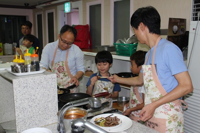 최근 인천시 남구 드림스타트가 아이의 올바른 식습관 형성 및 부자간 유대관계 형성을 위해 운영하고 있는 '부자유친 요리교실'에 참가한 아이와 아빠가 함께 밑반찬 등 요리를 만들고 있다. (사진제공=남구청)
