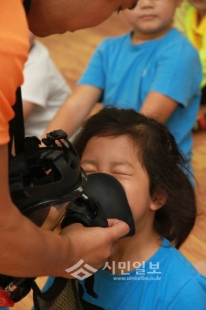 서울 구로소방서는 16일 금천구청 지하 1층 영·유아플라자 시흥점 체험학습실에서 어린이와 보육교사 등을 대상으로 인형극, 포그소화기를 활용한 가상 화재진화 체험, 소방관 복장 착용 등 소방안전 기본상식에 대해 교육했다. 사진은 공기호흡기를 착용해보는 아이의 모습. (사진제공=구로소방서)