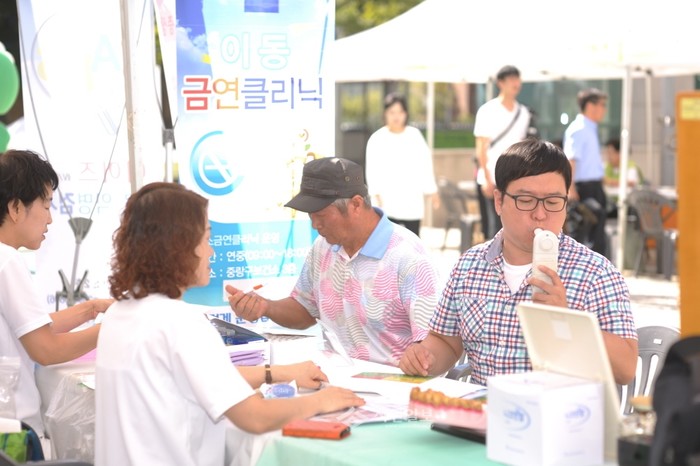 서울 중랑구는 16일 구청 로비와 1층 광장에서 지역주민들이 가까운 곳에서 더욱 쉽게 건강상태를 진단할 수 있도록 '2014 행복도시중랑 건강한마당'을 개최했다. 사진은 행사에 참가한 주민이 금연클리닉에 참여하고 있는 모습. (사진제공=중랑구청)