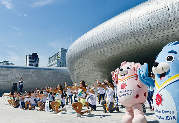 16일 오전 서울 동대문디자인플라자에서 한국방문위원회가 주최한 'K팝 페스티벌 인 인천'에서 외국인 참가자와 아시안게임 청년 서포터스가 인천 아시안게임 성공개최를 기원하며 K-POP과 아시안게임 주제가 '온리 원'에 맞춰 플래시몹을 선보이고 있다.