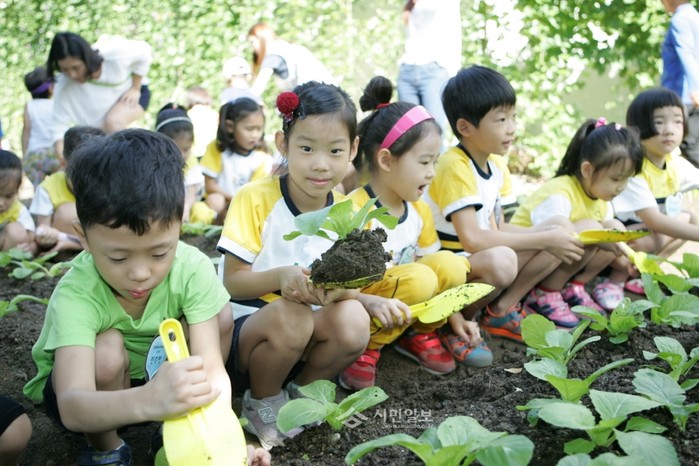 지난 16일 서울 성동구 서울숲 옆 도시농업체험장에서 비닐하우스에서 직접 키운 가을철 배추모종 심기 체험행사에 참여한 어린이집과 유치원 원아들이 삽을 들고 텃밭에서 배추 모종을 심고 있다.(사진제공=성동구청)