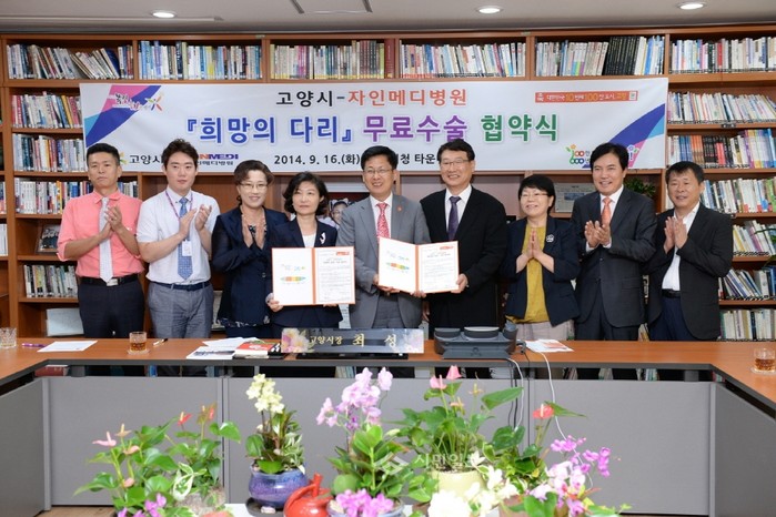 경기 고양시와 자인메디병원은 지난 16일 고양시청 타운미팅룸에서 저소득 소외계층을 위한 ‘희망의 다리’ 무료수술 지원 협약식을 맺고 이달부터 디스크 질환을 앓고 있는 덕양구 저소득 의료소외계층을 대상으로 총 20명에게 신경성형술 무료 수술을 지원한다. (사진제공=고양시청)