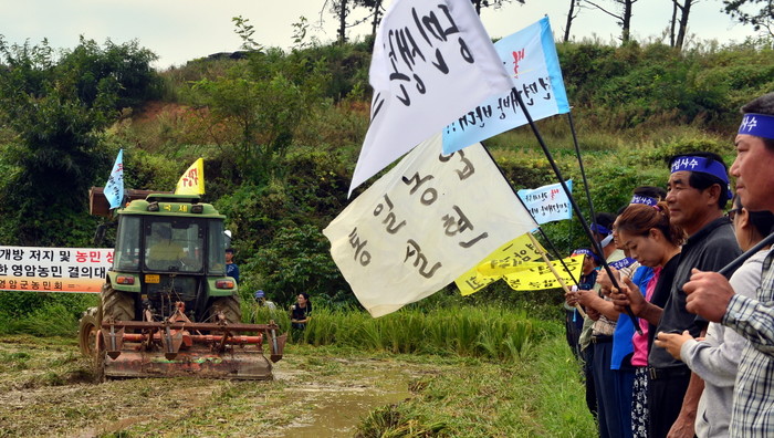 17일 오전 전남 영암군 시종면의 한 들녘에서 전국농민회총연맹 광주전남연맹이 '쌀 개방 저지' 논 갈아엎기 투쟁을 벌이고 있다.