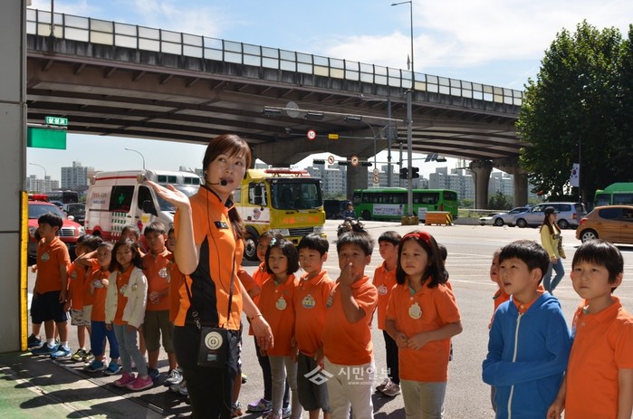 17일 서울 강남소방서를 방문한 '신사 어린이집' 원생들이 소방서 앞 공터에서 '소방안전교육'의 일환으로 소방서 건물과 소방차량 등의 관련 설명을 소방관에게 듣고 있다. (사진제공=강남소방서)