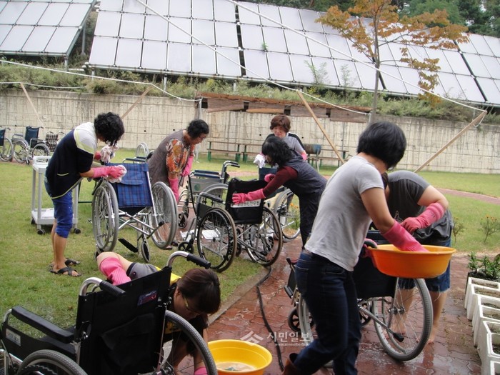 17일 경기 여주소방서 여성의용소방대원 20명은 창강요양원(여주시 가남읍 위치)을 방문해 심신이 불편하거나 치매인 노인들의 손과 발이 돼 목욕과 요양원 주변 환경정리 등 사랑의 봉사활동을 실시했다. 사진은 휠체어를 세척하는 대원들의 모습. (사진제공=여주소방서)