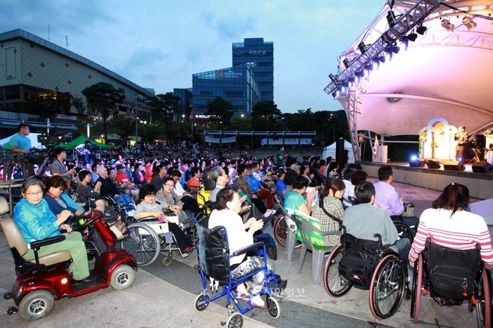 최근 경기 용인시 동백호수공원에서 장애인과 비장애인의 편견과 경계를 허물고 함께하는 행복한 공동체를 만들기 위한 '제7회 용인시 장애인과 비장애인이 함께하는 한마음 대축제'가 열렸다. 사진은 개회식에 참여한 관객들이 무대를 바라보는 모습.(사진제공=용인시청)
