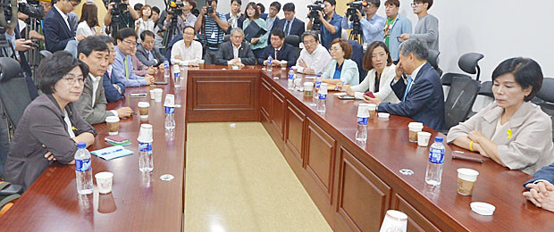 새정치민주연합 박영선 국민공감혁신위원장 겸 원내대표의 입장발표를 앞둔 17일 오전 서울 여의도 국회의원회관 제5간담회장에서 당내 소장파 의원들이 긴급의원단 모임을 갖고 논의를 하고 있다.