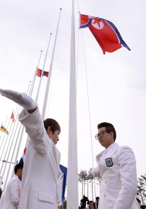 18일 오전 2014 인천아시아경기대회 아시아드선수촌 국기광장에서 열린 선수촌 입촌식에서 행사 도우미들이 북한 인공기 게양 예행연습을 하고 있다.