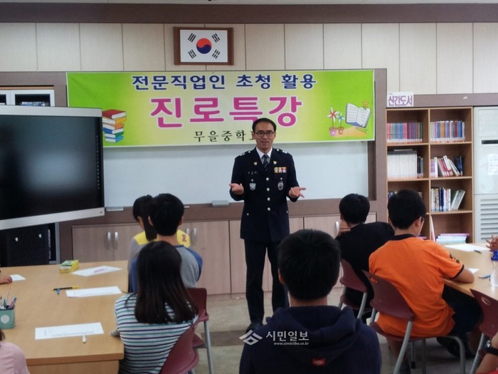 경북 구미 무을중학교 도서관에서는 지난 17일 자신에게 맞는 진로를 스스로 탐색, 올바르게 이해하고 직업에 대한 건전한 가치관을 갖도록 하기 위해 무을파출소 임지환 경감의 특강을 실시했다. (사진제공=구미교육지원청)