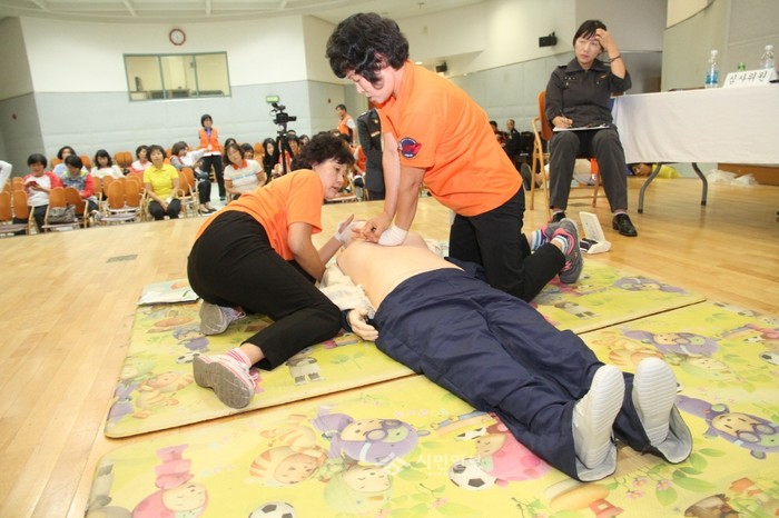 지난 17일 서울 동작소방서 3층 강당에서 나경원 국회의원 및 구의원을 비롯한 내빈들이 참석한 가운데 열린 '제1회 동작소방서장배 의용소방대 심폐소생술 경연대회'에 참가한 의용소방대원들이 심폐소생술을 실시하고 있다. (사진제공=동작소방서)