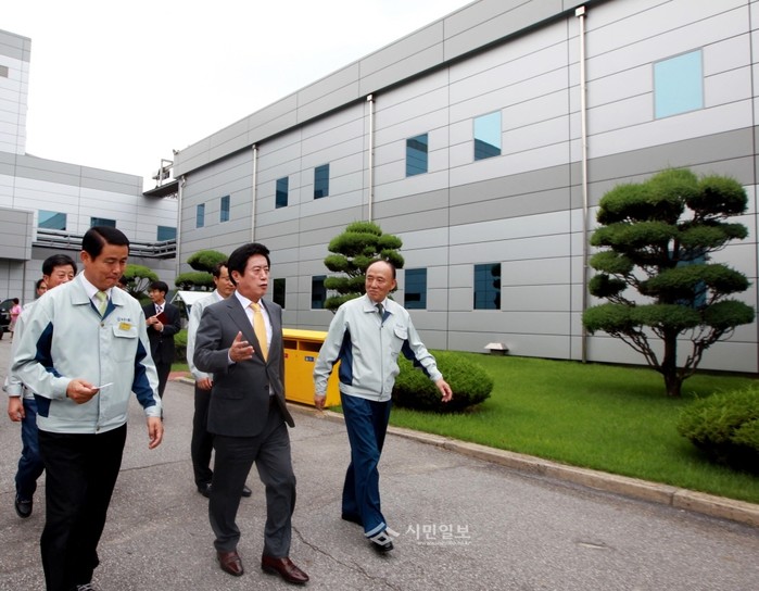 | ▲ 정찬민 용인시장(가운데)이 백암면 근곡리에 소재한 (주)제일약품을 방문해 관계자들과 대화를 나누며 걷고 있다. | ||