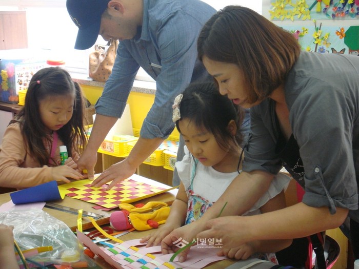 경북 구미시 원호초등학교가 최근 학부모 500여명이 참가한 가운데 개최한 색다른 '학부모 참여형 수업공개' 시간에 학부모가 자녀와 함께 미술작품을 만들고 있다. (사진제공=구미교육지원청)
