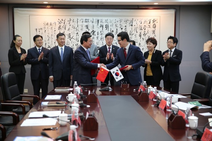 지난 17일 자매도시인 중국 북경시 회유구를 방문한 정원오 서울 성동구청장이, 양구의 문화·교육 교류에 관한 업무협약(MOU)를 체결하고, 북경시 회유구 창웨이 인민정부구장(왼쪽)과 악수를 하고 있다. (사진제공=성동구청)