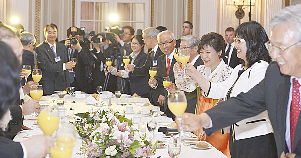 국빈으로 캐나다를 방문한 박근혜 대통령이 20일(현지시각) 오후 오타와 시내 한 호텔에서 열린 동포만찬간담회에 참석, 건배하고 있다.