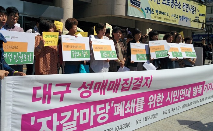 성매매방지법 시행 10주년을 하루 앞둔 22일 오전 대구지역 여성단체와 시민단체가 대구시청 앞에서 '대구 성매매집결지 자갈마당 폐쇄를 위한 시민연대' 발족식을 열고 대구지역의 대표적인 성매매집결지인 '자갈마당' 폐쇄를 촉구하고 있다.