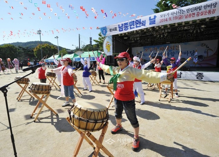 최근 경기 광주시 남종면 공설운동장에서 조억동 광주시장, 소미순 시의회의장 등 500여명이 참석한 가운데 남종면민의 친목과 화합을 위한 축제인 '제14회 남종면민의 날 행사'를 개최했다. 사진은 분원리 노인 회원들이 난타연주를 하는 모습. (사진제공=광주시청)