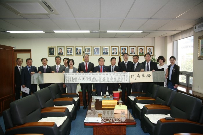 중국 산동성 조장시 악증파(岳增波) 투자유치국장을 비롯한 대표단 7명은 최근 서초구의회를 방문해 오케이민원센터를 견학하고 구와의 교류확대와 투자협력을 위해 간담회를 진행했다. 사진은 조장시 대표단, 서초구의회 및 상공회의소 관계자들이 간담회 후 기념촬영을 하는 모습. (사진제공=서초구의회)