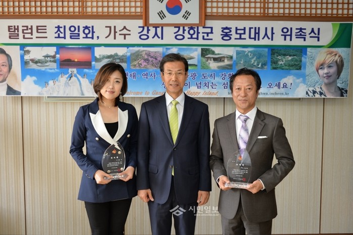 지난 23일 인천시 강화군은 군수실에서 강화군의 문화와 관광명소, 지역축제 및 특산물 등의 홍보를 맡게 될 홍보대사로 탤런트 최일화씨와 가수 강지씨를 위촉했다. 사진은 이날 위촉식에 참석한 가수 강지씨, 이상복 강화군수, 탤런트 최일화씨(왼쪽부터)의 모습.(사진제공=강화군청)