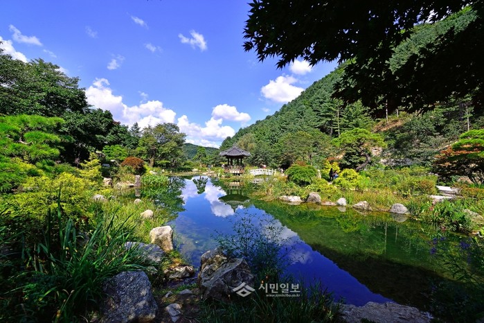 | ▲ 아침고요수목원에 조성된 정자와 연못의 모습. | ||