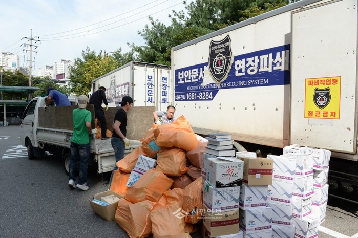 서울시 최초로 중요기록물 전산화사업을 완료한 서울 동대문구가 지난 23일 보존기간이 지난 기록물 1만4983권을 선별해 현장파쇄 작업을 통해 폐기했다. 사진은 구청 후정 주차장에서 보존경과 경과 기록물 파쇄 작업이 진행되는 모습. (사진제공=동대문구청)