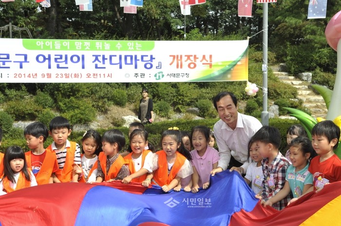 지난 23일 서울 서대문구 백련산 논골공원내에 500㎡ 규모로 조성된 '어린이 잔디마당' 개장식에 참석한 문석진 서대문구청장이 아이들과 함께 레크리에이션 활동을 하고 있다. (사진제공=서대문구청)