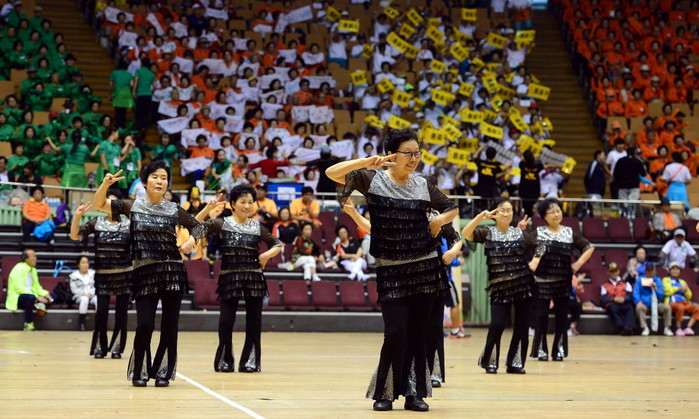 24일 서울 송파구 잠실체육관에서 열린 '어르신 생활체육 축제'에서 생활체조 부문에 참가한 노인들이 공연을 펼치고 있다.