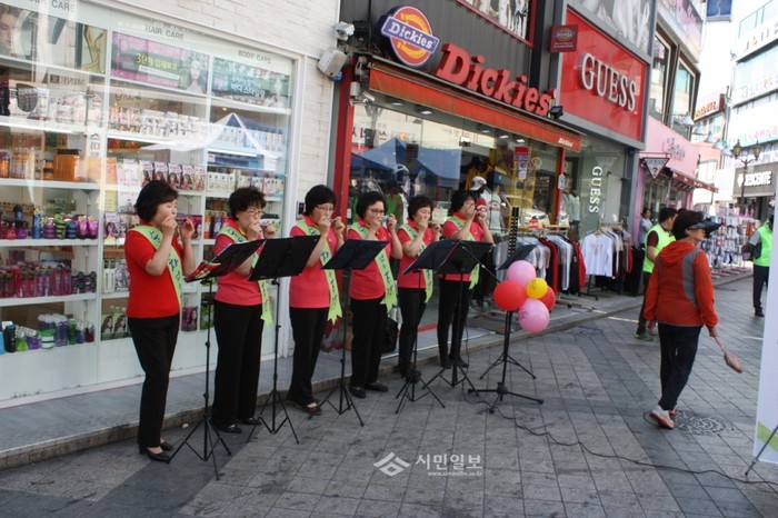 지난 22일 경기 이천시 중앙로 문화의 거리에서는 공무원과 지역주민이 함께 참여하는 '승용차 없는 날' 행사를 맞아 이천시자원봉사협의회 주관으로 다채로운 행사가 열렸다. 사진은 봉사협의회원들이 '승용차 없는 날' 행사를 맞아 하모니카를 연주 중인 모습. (사진제공=이천시청)
