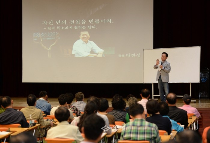 서울 동대문구는 지난 24일 오후 3시 구청 2층 다목적강당에서 <맥가이버>, <아마데우스> 등으로 우리에게 친숙한 국민성우 배한성씨를 초청 ‘자신만의 전설을 만들어라’ 라는 주제로 예그리나 명사특강을 열었다. 사진은 배한성씨가 강연을 하고 있는 모습. (사진제공=동대문구청)