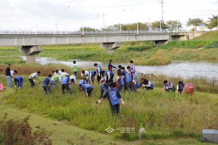 지난 24일 충남 아산시가 모종동 온양천 일대에서 하천 생태계를 복원하고 녹색생활공간을 조성하는 한편 시민들에 친수문화공간을 제공하기 위해 인근 주민, 기업체 직원, 공무원 등 120여명이 참여해 환경정화활동을 실시했다. 사진은 잡초를 제거하고 쓰레기를 수거하는 참여자들의 모습. (사진제공=아산시청)