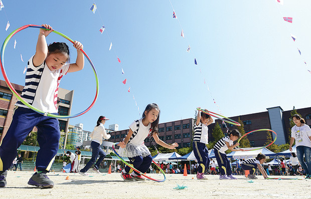 화창한 가을날씨 속에 초등학교 운동회가 한창이다. 25일 오전 경기 수원의 한 초등학교에서 열린 운동회에서 어린이들이 훌라후프를 통과해 달리는 장애물 달리기를 하고 있다.