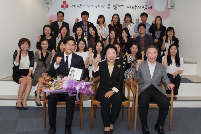 지난 25일 '사회복지공동모금회'의 홍보대사로 위촉된 배우 이상윤씨가 서울 중구 사랑의열매회관 6층에서 열린 위촉식에 참여해 앞으로 나눔을 알리고 확산시키는 데 최선을 다하겠다고 소감을 밝힌 후 관계자들과 기념촬영을 하고 있다. (사진제공=사회복지공동모금회)