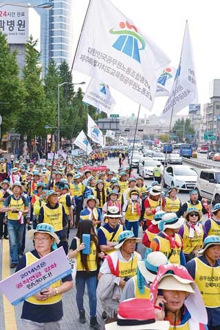 대한민국공무원노동조합총연맹 공무원들이 27일 오후 서울역 광장에서 9.27 공적연금 복원을 위한 공노총 총력결의대회를 마친 뒤 을지로 방향으로 행진하고 있다.