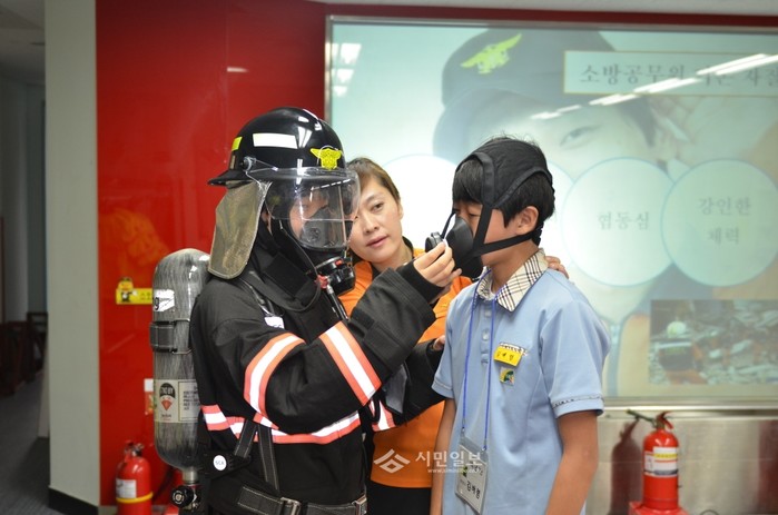 29일 서울 강남소방서에서 열린 직업체험교육에 참가한 세곡중학교 학생이 소방관의 지도하에 방화복, 산소통 등의 소방장비를 착용하고 인명구조 활동을 체험하고 있다. 이날 교육에서는 심폐소생술 및 진로 교육 등도 열렸다. (사진제공=강남소방서)
