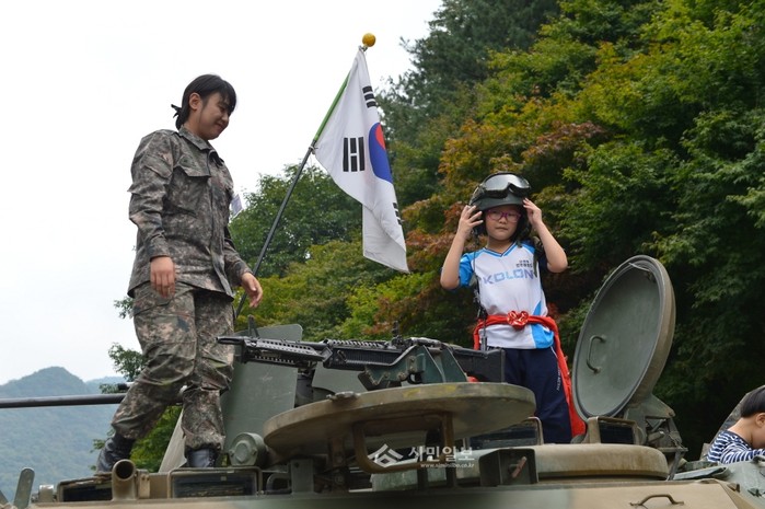 지난 27일 경기 동두천시 소요산관광지에서 육군 제26사단, 제28사단, 6포병여단, 미 2사단이 함께 각 군의 전차, 장갑차 등의 장비를 전시하고 직접 타볼 수 있는 기회를 제공하는 '군 장비 전시 및 군악대 공연'을 개최했다. 사진은 장비에 올라 체험 중인 어린이의 모습. (사진제공=동두천시청)
