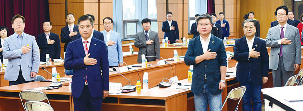 29일 오전 경기 수원 경기도교육청에서 이재정 경기교육감과 광명, 구리, 시흥, 안양, 오산, 의정부, 화성, 성남 등 8개 시장 등이 학교 현장과 학생 중심의 2015년 혁신교육지구 발전방향 논의에 앞서 국민의례를 갖고 있다.