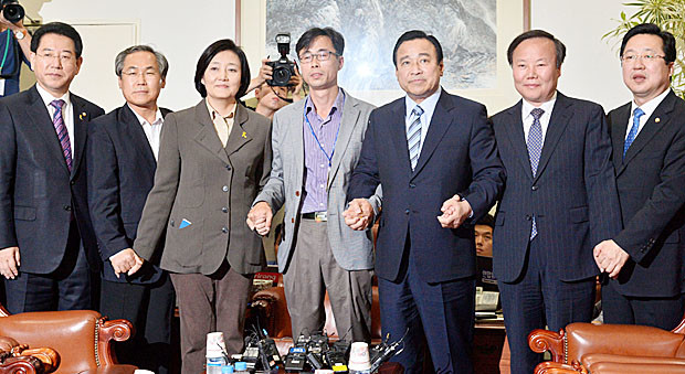 새누리당 이완구 원내대표, 새정치민주연합 박영선 원내대표 등 여야 원내지도부와 전명선 세월호 가족대책위 위원장이 29일 오후 서울 여의도 국회 운영위원장실에서 세월호 특별법 관련 회동에 앞서 손을 맞잡고 있다. 오른쪽부터 새누리당 이장우 원내대변인, 김재원 원내수석부대표, 이완구 원내대표, 전명선 세월호 가족대책위 위원장, 새정치민주연합 박영선 원내대표, 우윤근 정책위의장, 김영록 원내수석부대표.