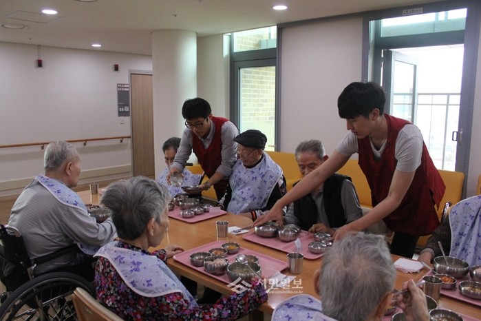 지난 27일 아워홈 직원 20명은 강북실버종합복지센터를 방문해 쾌적한 주거환경을 위해 생활관과 식당의 유리창 및 바닥을 청소하고 건강삼계탕 준비를 도왔다. 사진은 직접 준비한 건강삼계탕을 노인들에게 전달하고 있는 직원들의 모습. (사진제공=강북실버종합복지센터)