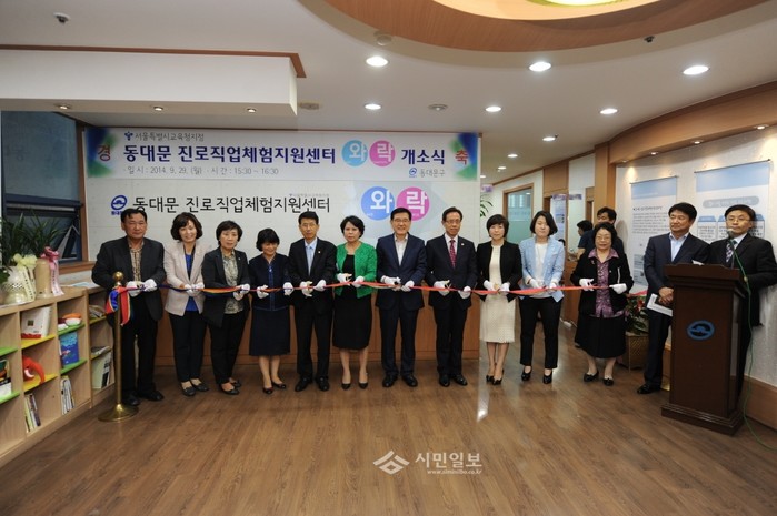 서울 동대문구는 지난 29일 구청 옆 동양프라자 3층에서 초·중·고등학교 청소년들에게 다양한 진로탐색 정보와 직업체험의 기회를 제공하게 될 '동대문 진로직업체험지원센터' 개소식을 했다. 사진은 유덕열 동대문구청장(가운데)과 김명곤 동대문구의장이(오른쪽 네번째)이 테이프 컷팅식을 하고 있는 모습. (사진제공=동대문구청)