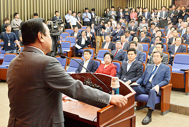 새누리당 의원들이 30일 오후 서울 여의도 국회에서 열린 의원총회에서 이완구 원내대표의 발언을 경청하고 있다.