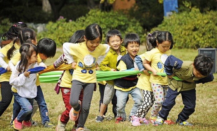 지난 1일 서울 광진구 구의2동 어린이대공원내 구의문 잔디밭에서 개최된 '제6회 나도 피카소 꿈나무 미술대회 및 전통문화체험 행사"에 참가한 어린이집 원아들이 서로 편을 나눠 게줄다리기를 하고 있다.(사진제공=광진구청)