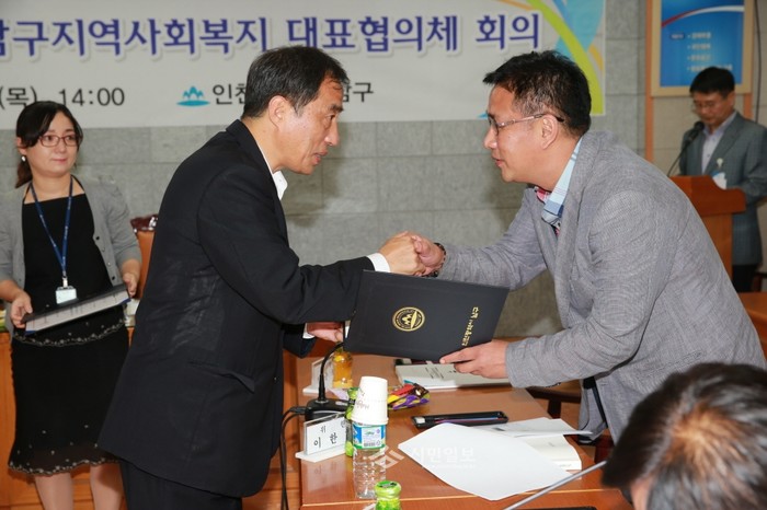 인천시 남구는 최근 구청 소회의실에서 박우섭 구청장을 비롯한 지역사회복지대표협의체 위원들이 참석한 가운데 '지역사회복지 대표협의체'를 개최하고 신규 위촉식을 진행했다. 사진은 박 구청장(왼쪽)이 이한형 남구 의원에게 위촉장을 전달하는 모습. (사진제공=남구청)