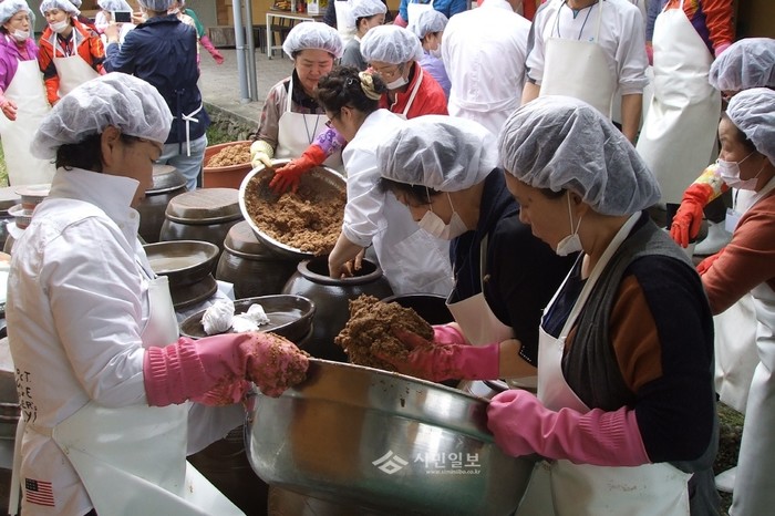 경기 여주시 농업기술센터에서는 7개월간 전통장류제조사, 김치소믈리에, 전통주&양조식초, 생활원예, 통기타 과정 등 2개 부문·5개 과정의 생활기술전문교육을 통해 150여명의 교육생을 배출했다. 사진은 생활기술전문과정에 참가해 장을 만들고 있는 교육생들의 모습. (사진제공=여주시청)