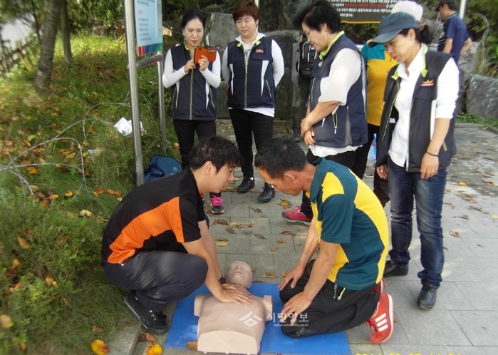 최근 경기 오산소방서가 필봉산을 방문한 등산객들의 산악사고를 예방하고 사고가 발생했을 때 신속히 대응할 수 있도록 돕기 위한 안전사고 예방캠페인, 심폐소생술 체험 등을 포함하는 '등산목 안전지킴이' 활동을 실시했다. 사진은 소방관의 도움을 받아 심폐소생술을 체험하는 등산객의 모습. (사진제공=오산소방서)