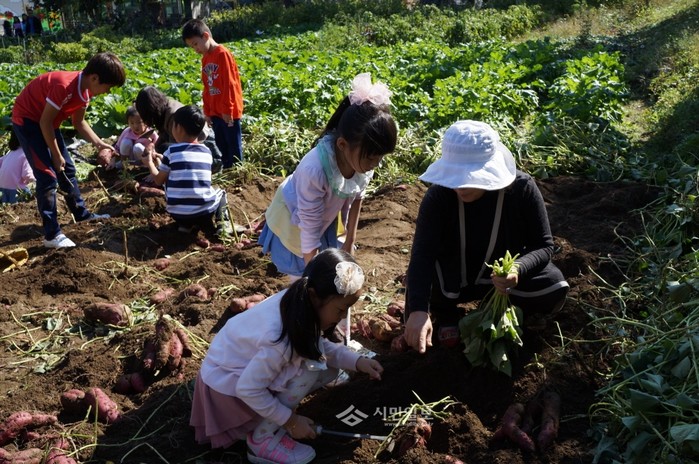 경기 가평군 연하초등학교에서 6일 전교생이 모두 모여 그동안 학교 텃밭에서 정성으로 키워온 고구마를 수확하는 시간을 보냈다. 사진은 고구마를 수확하고 있는 학생들의 모습. (사진제공=연하초등학교)