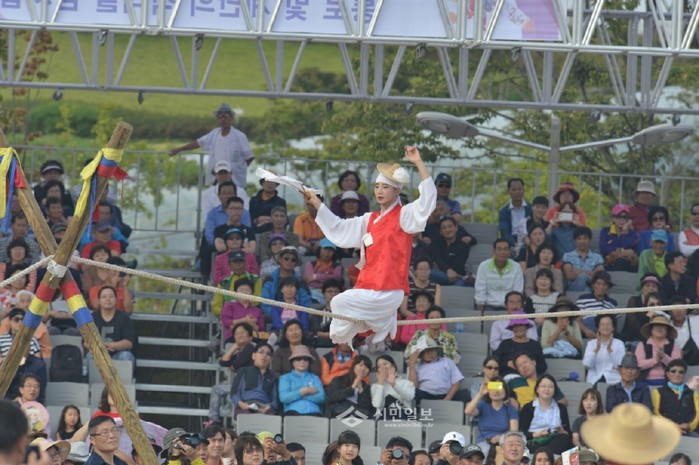 최근 경기 안성시 안성맞춤랜드에서 황은성 시장, 유광철 시의회의장 등 관계자들과 지역 주민 1000여명이 참여한 가운데 '2014 안성맞춤남사당바우덕이축제' 개막식이 열리고 축하 공연이 진행됐다. 사진은 축제에서 줄타기 공연이 진행 중인 모습. (사진제공=안성시청)