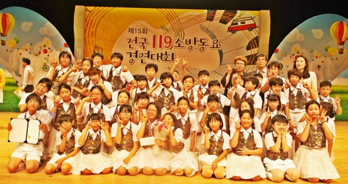 경기 양주시 장흥 삼상초등학교는 2012년 금상, 2013년 은상에 이어 최근 '제15회 전국119소방동요대회'에서 초등부 은상을 수상했다. 사진은 이번 대회에 참가한 초등생들이 은상 시상식 후 기념촬영을 하는 모습. (사진제공=양주소방서)